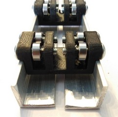 The rail is constructed using 2 lengths of aluminium corner profiles and some printed parts. Before printing, make sure the measurements are correct: if you lay them as is seen on the picture, the measurement in between the upright walls should be at least 30mm so a bearingblock fits loose in between them.